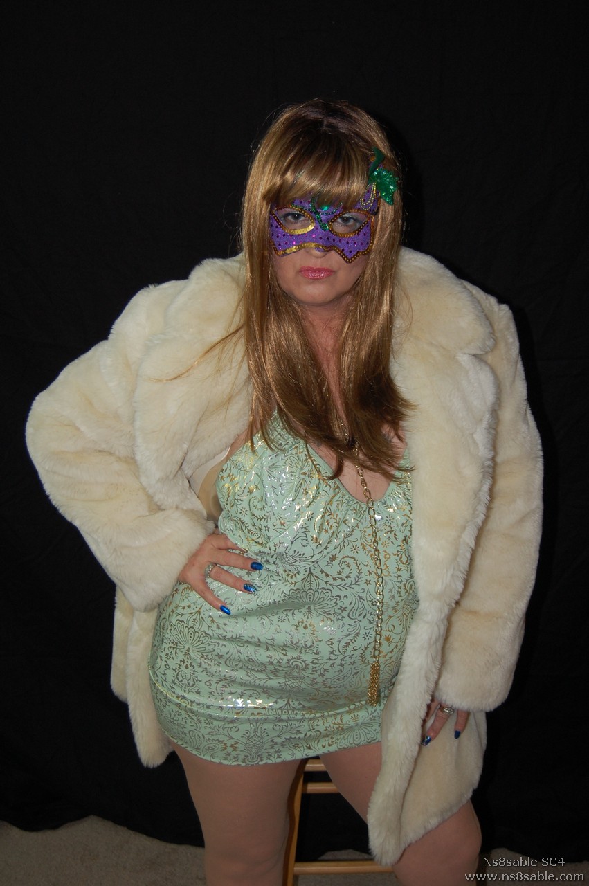 Mysterious woman in fur. Dressed in a short green dress, wig, nude hose, panties, mask, & heels. Invited to an erotic masked party I'm ready to make all of their fantasies come true. I love the mystery part not knowing who is who. Just the thought makes me so wet, I crave their cocks in my mouth & deep inside of me. No strings or attachments just some hot erotic sex. Will you be there?