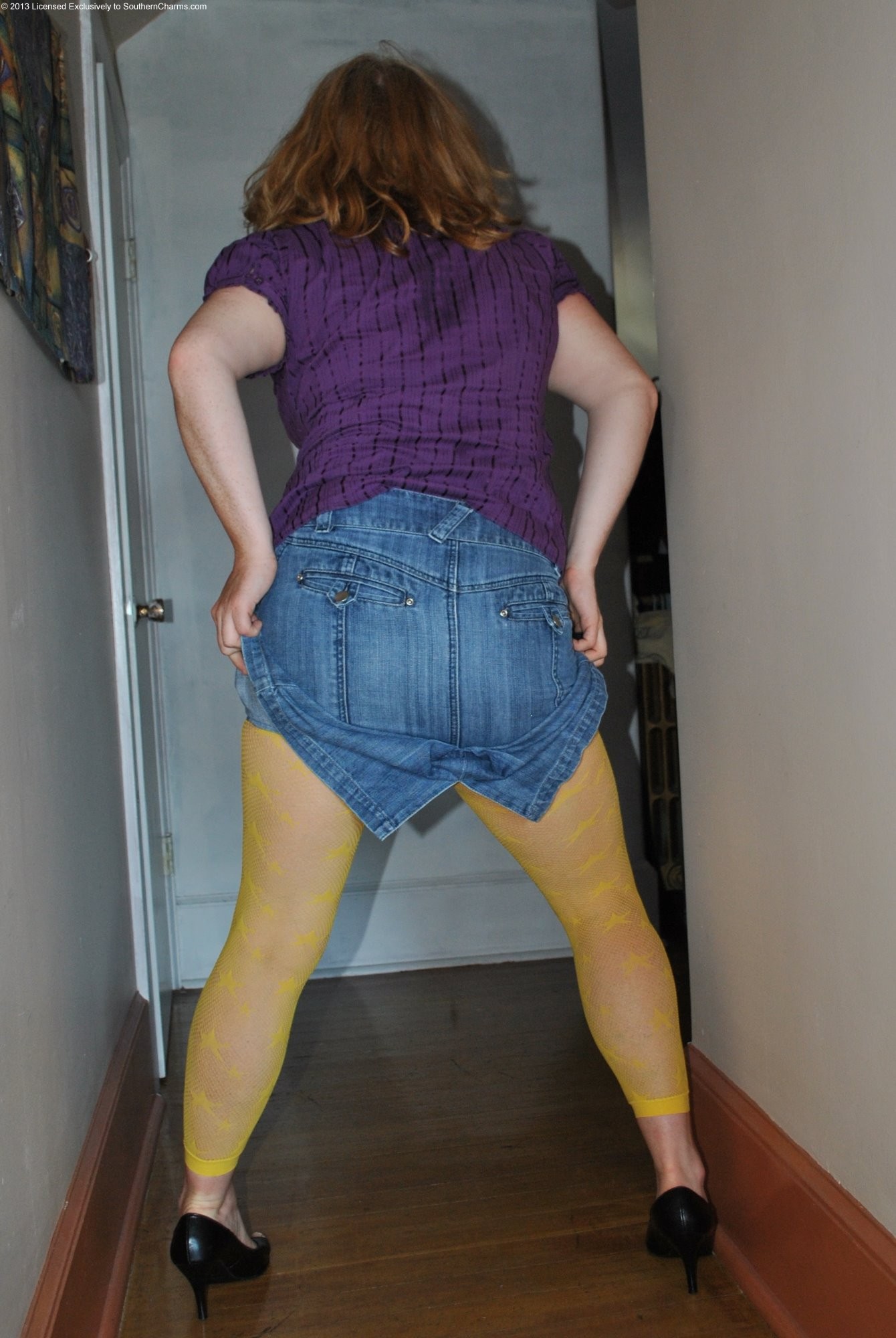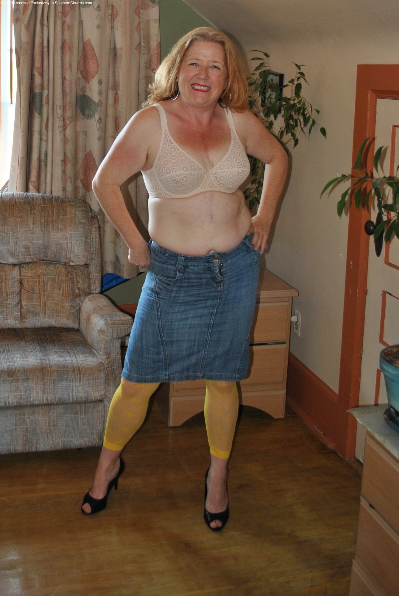 I squeezed into a tight jean skirt just for you. Come see my long curvy legs encased in bright yellow fishnet pantyhose. A seamed bullet style bra add an element of a classic look.