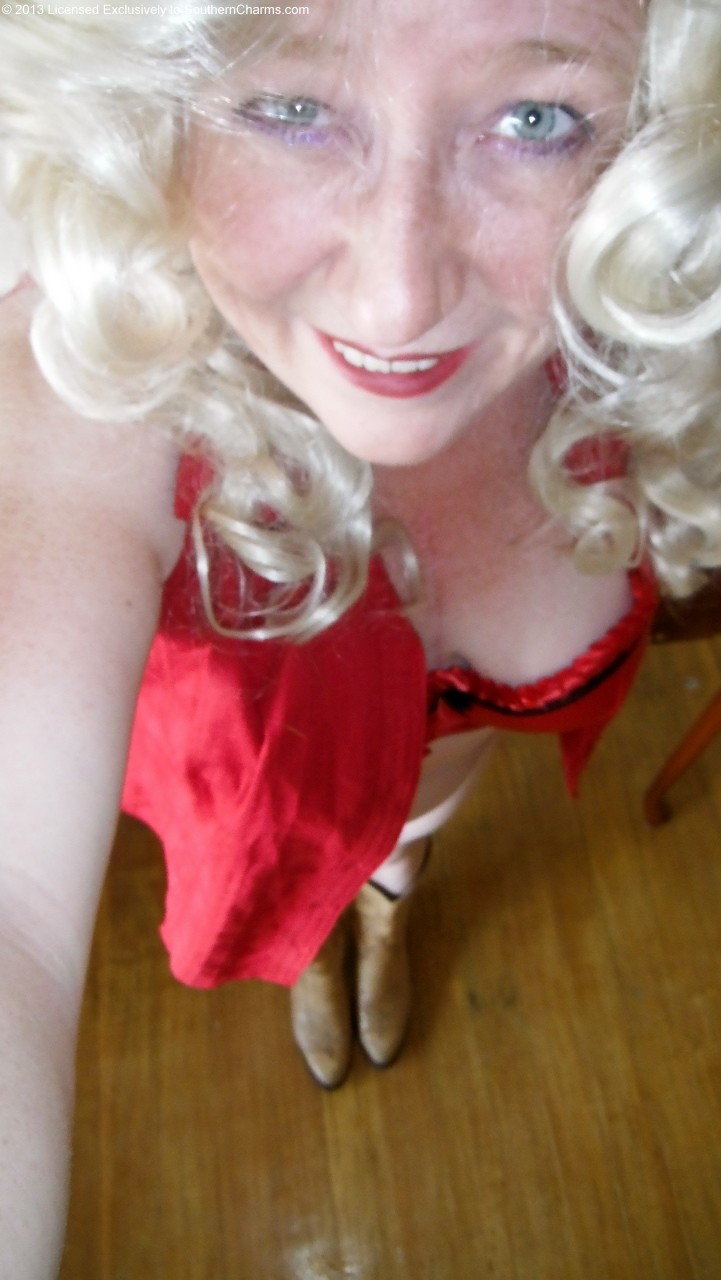 I have a few wigs but have only been inspired to try them. The blonde wig creates a very different look but goes very well with the red shirt and denim skirt. I have had the cowboy boots for more than half my life, they have taken me to college, luckily in cowboy country so I fit in and on many adventures since. At the end of the set I was getting hot so took off the wig and used the pantyhose for improvised handcuffs/bondage gear.