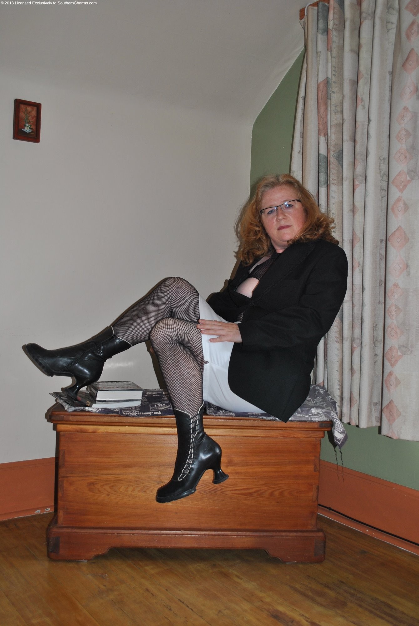 I am trying something a bit more formal in a blazer and white skirt but the look gets trashy after that with full fishnet crotchless body suit and lace up short leather fluvog boots.
