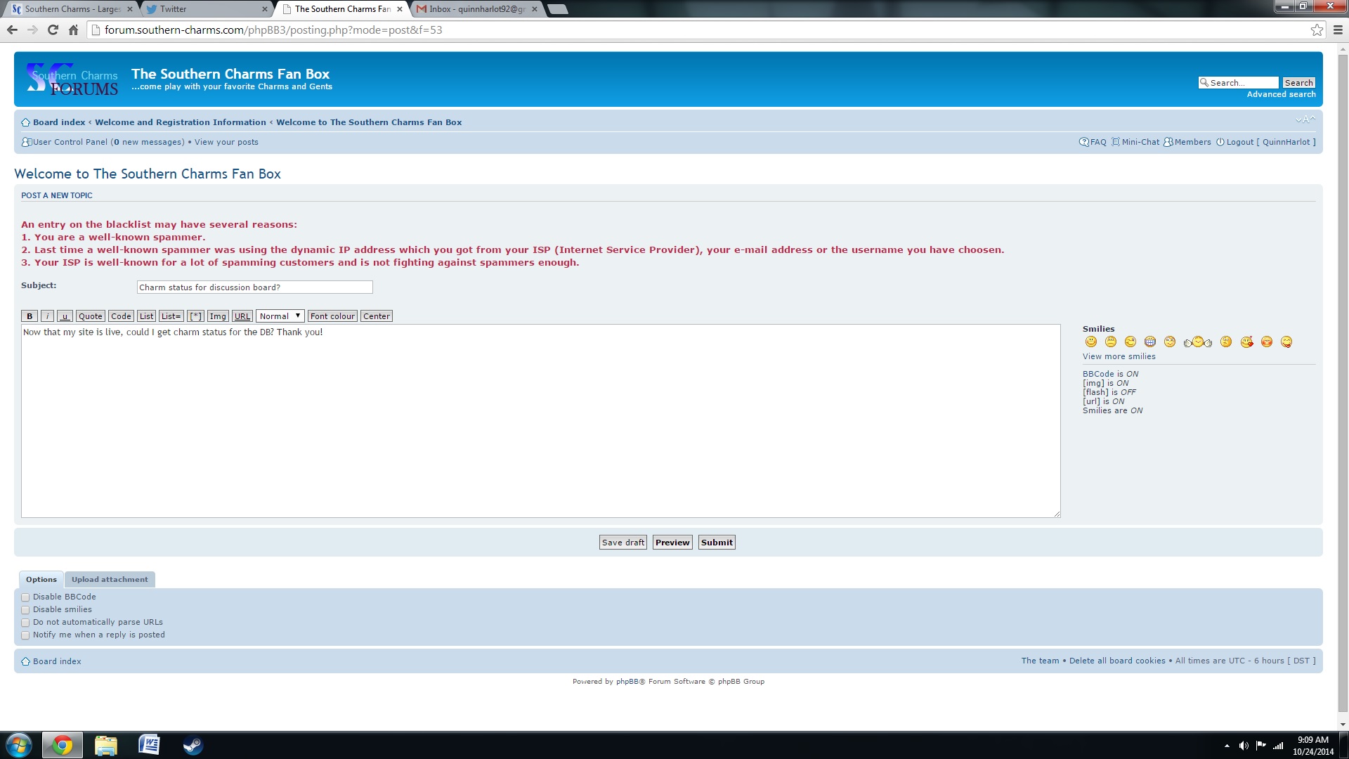 I attached a screen shot of the message I just got while trying to post. What is going on?? I haven't been spamming anyone :(